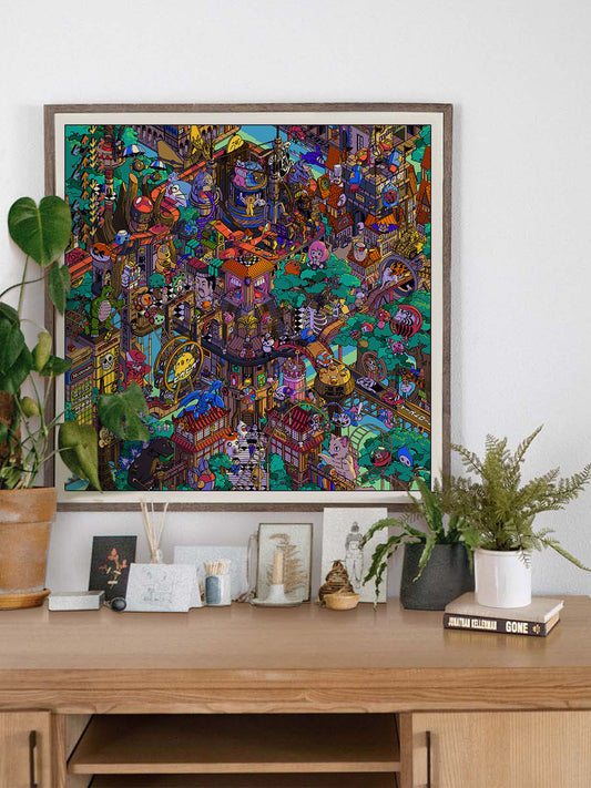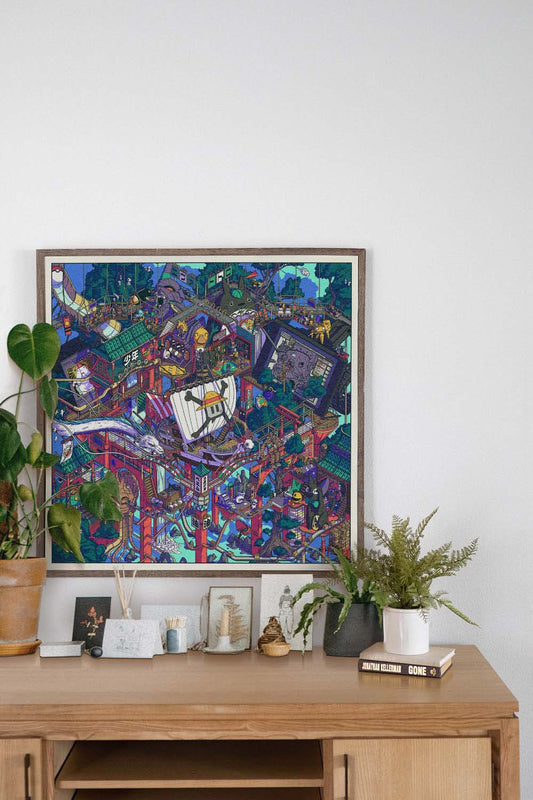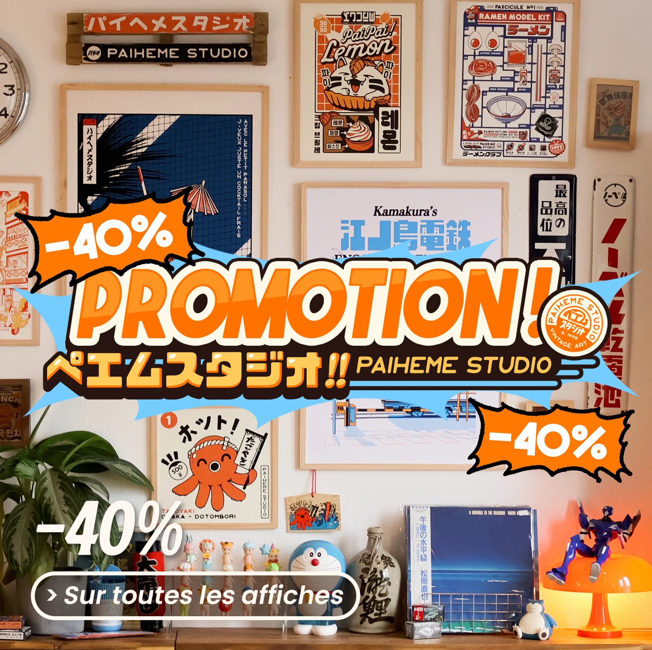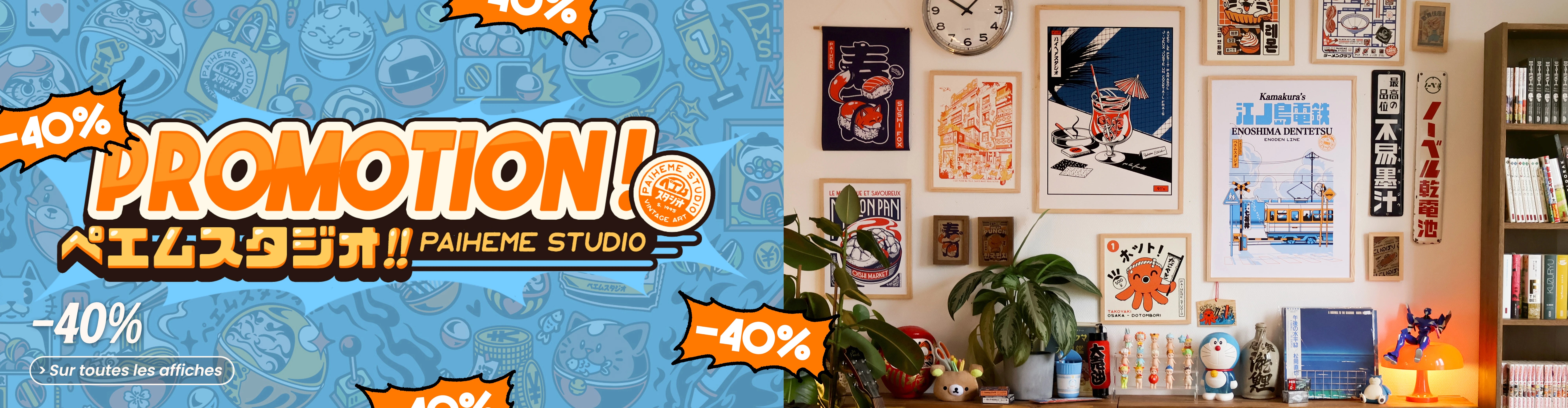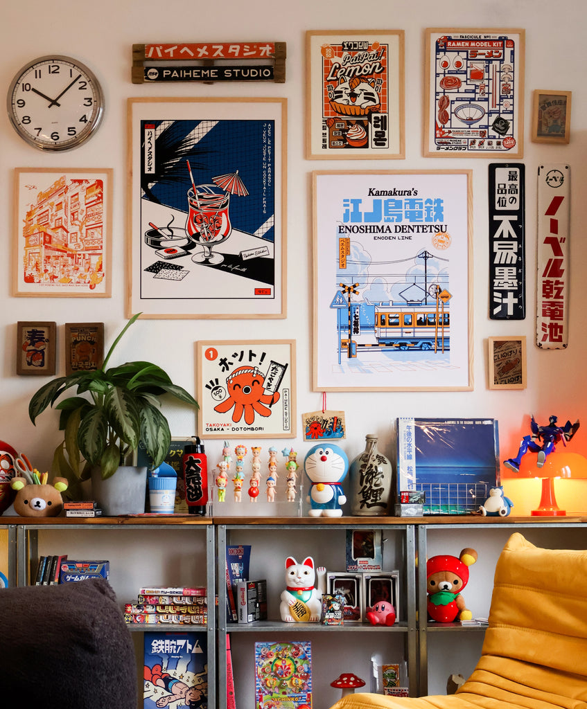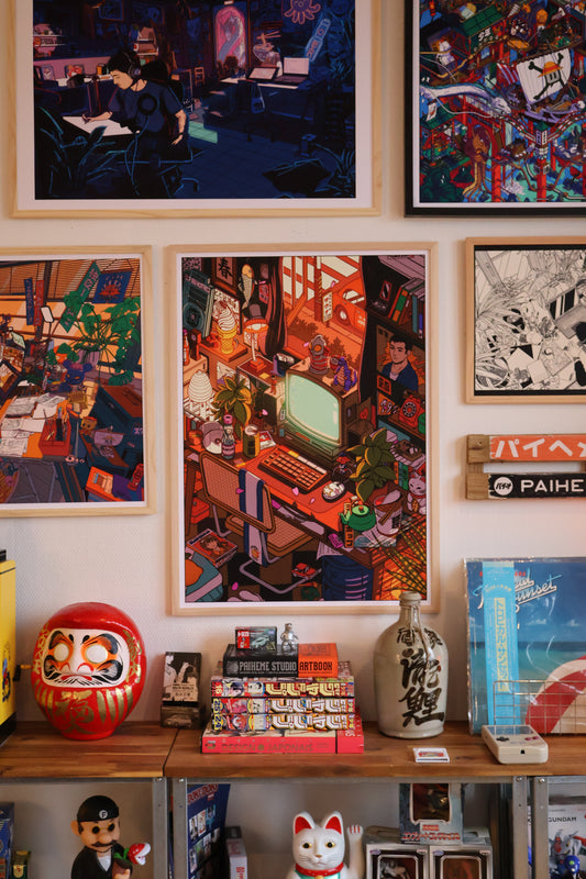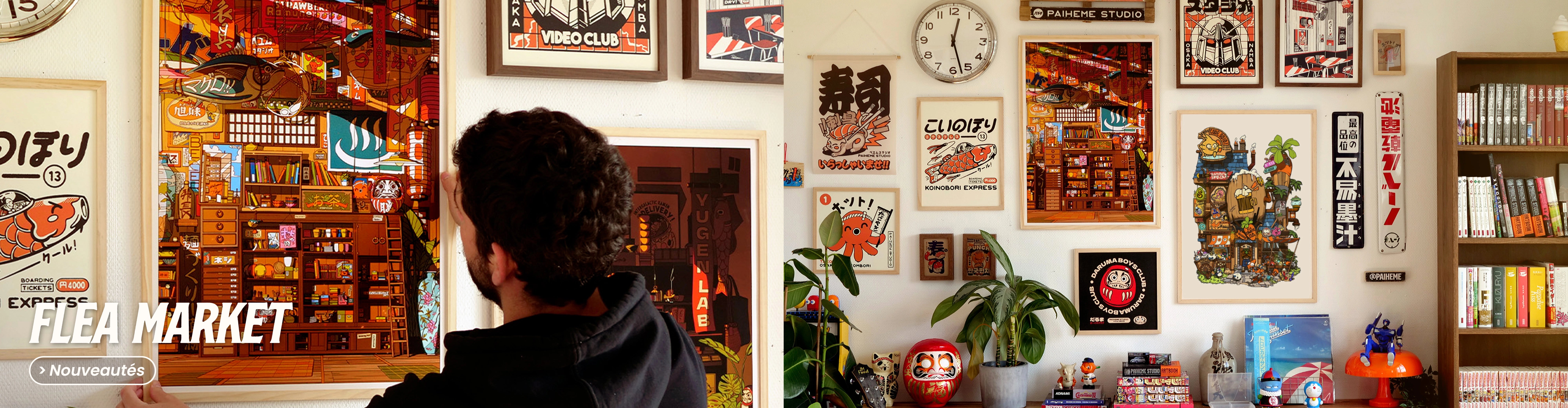 Paiheme Studio imagine des affiches, puzzles textiles et objets graphiques mêlant culture japonaise, esthétique vintage et influences pop culture.