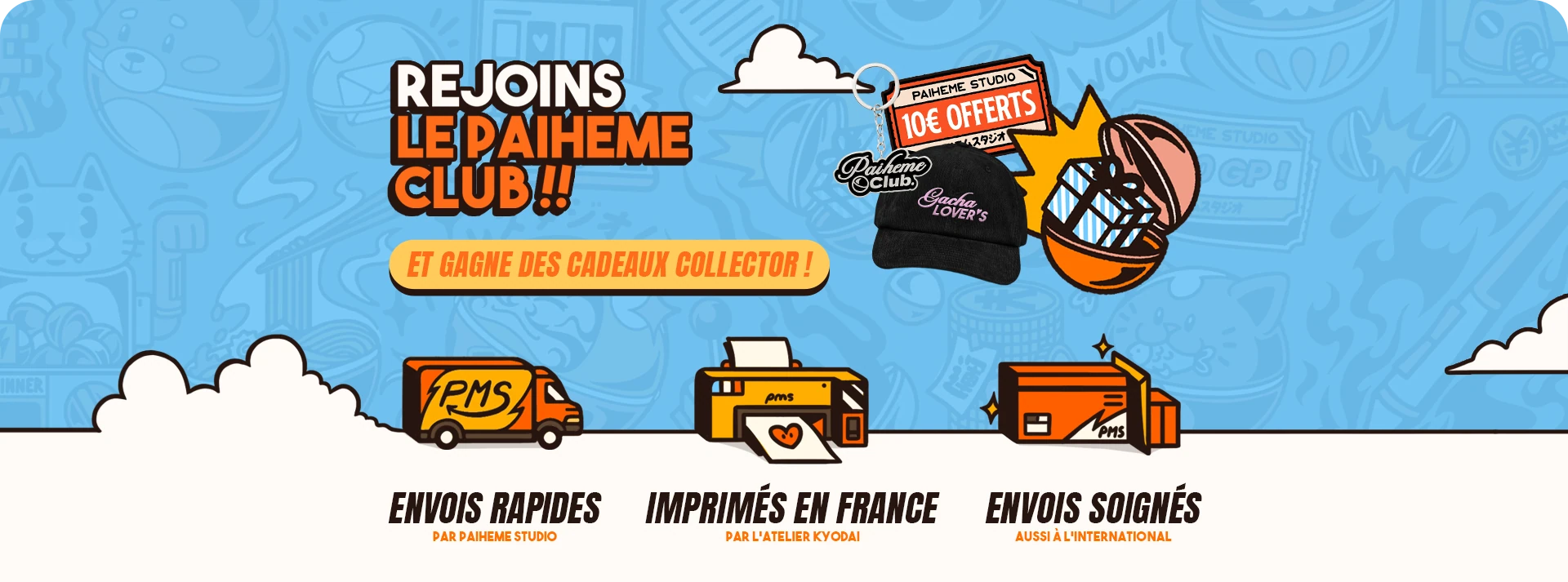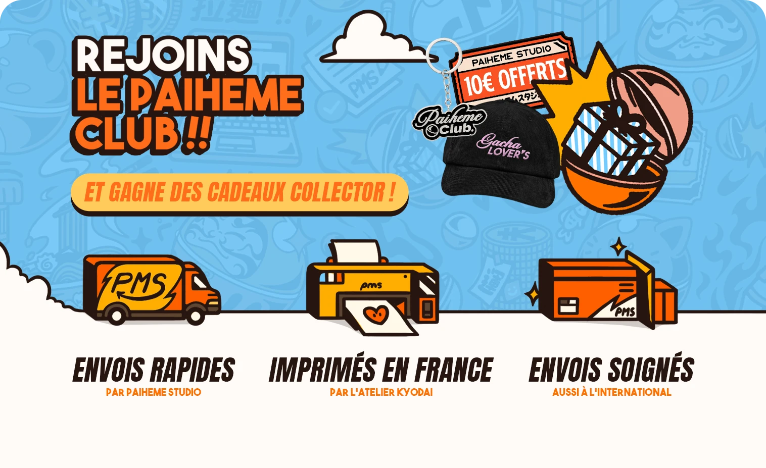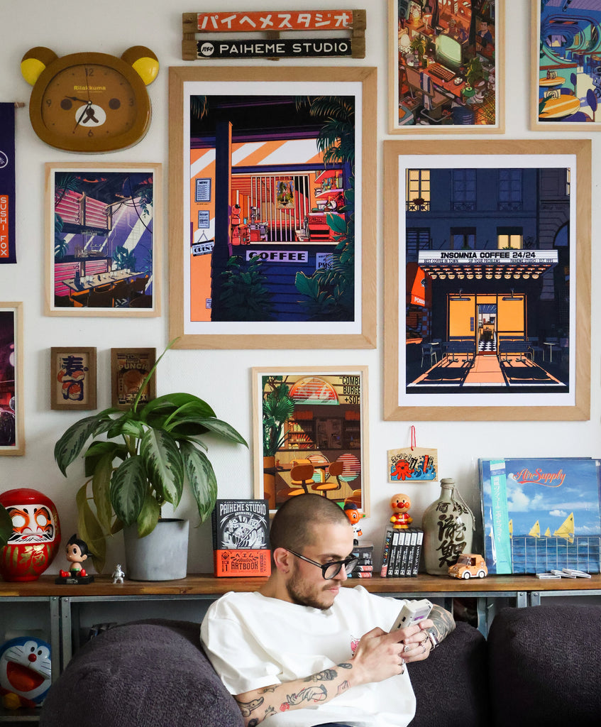 L’univers Paiheme Studio se distingue par son mélange de nostalgie et de modernité : des visuels colorés, remplis de références japonaises, de clins d’œil à la pop culture et de graphismes vintage revisités.