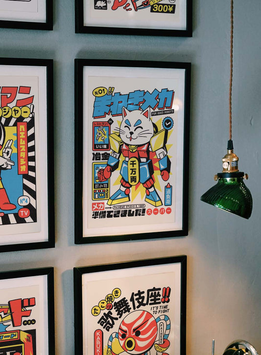 Une collection d’affiches rétro japonaises mêlant culture populaire, graphisme vintage et références au manga, aux kaijus et au cinéma japonais.